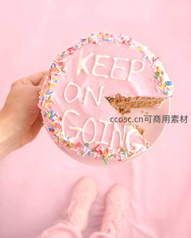 一只手托着圆形粉色奶油蛋糕,表面用白色奶油写着“KEEP ON GOING”,边缘撒满彩色糖珠,切去一角露出内部蛋糕体。