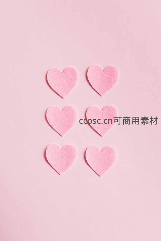 六颗粉色毛毡爱心整齐排列在纯色背景上