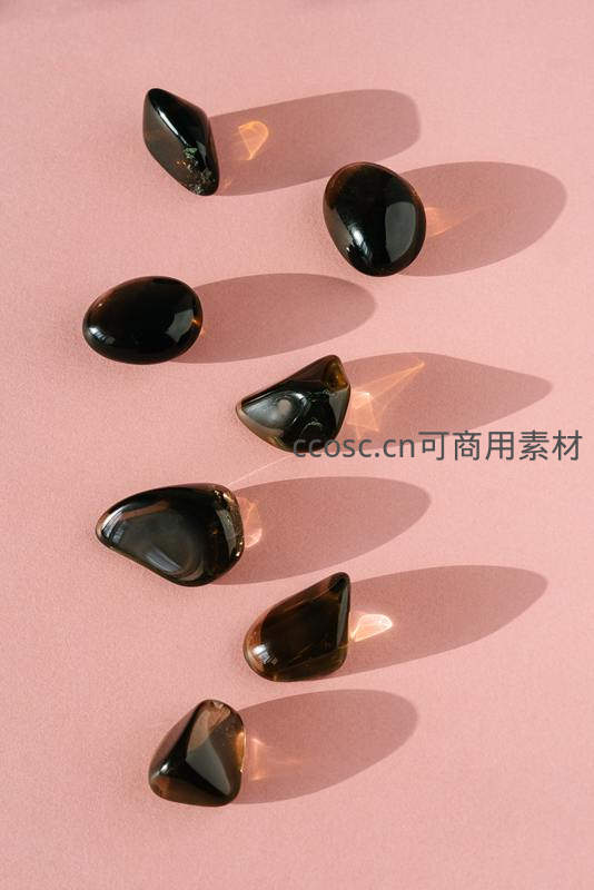 几颗不规则的黑色玻璃石块随意散落在柔和的粉红色平面上,阳光投下清晰的阴影,营造出简约而富有质感的静物艺术氛围。