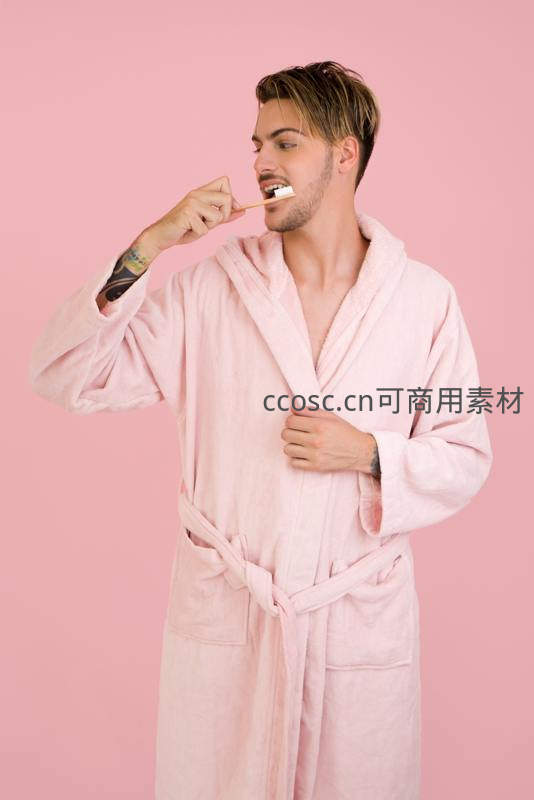 男子粉色浴袍刷牙日常