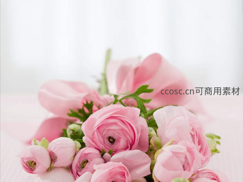 淡粉色的洋牡丹花束静置于浅色背景前,花瓣层层叠叠如丝绸般柔滑,绿叶点缀其间,营造出宁静、温馨且充满生活气息的视觉享受。