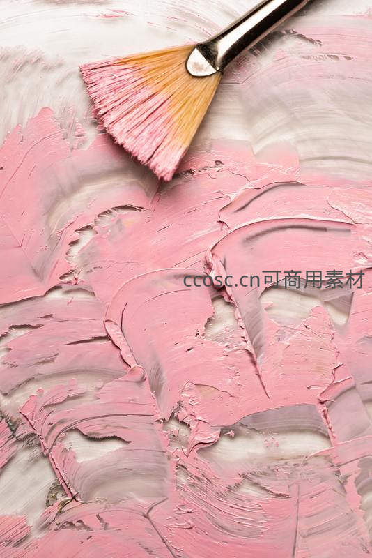 一把扇形画笔静置于被涂抹开的粉色与白色颜料之上,记录下创作过程中的动态痕迹,充满艺术灵感与手工温度。