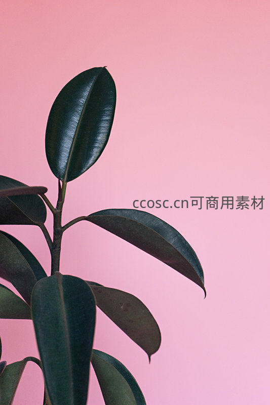 深绿色橡皮树叶片在明亮粉色背景的衬托下更显生机勃勃,叶片纹理清晰,是现代家居或办公空间的理想装饰元素。