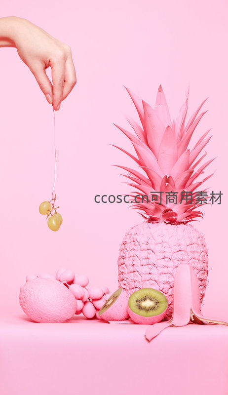 在统一粉色背景下,手轻提一串绿葡萄,旁边摆放着粉菠萝、奇异果等水果,构图精致充满艺术感。