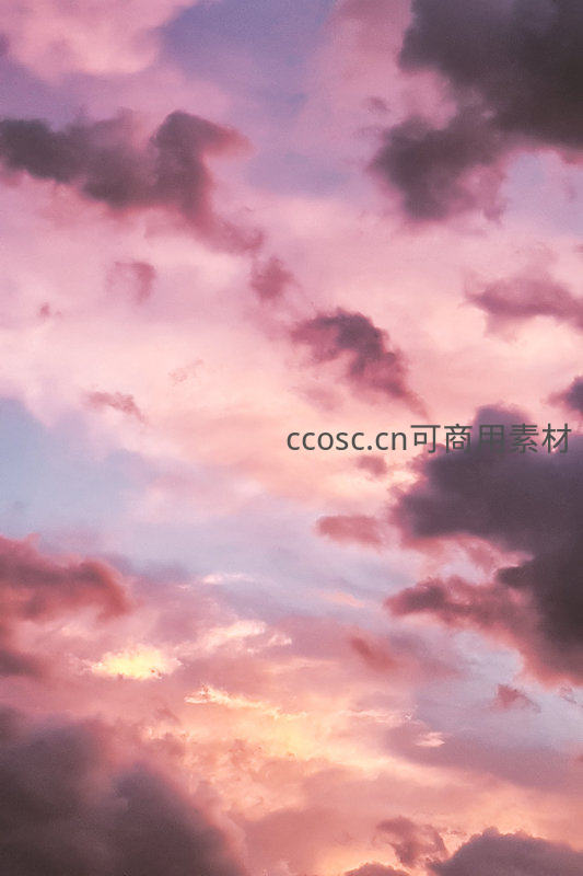 夕阳西下,天空被染成梦幻的粉紫色,层层叠叠的云朵如燃烧的火焰,展现大自然壮丽的光影奇观。