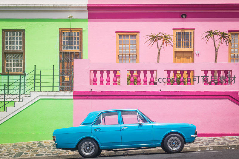 彩色建筑前的复古蓝车