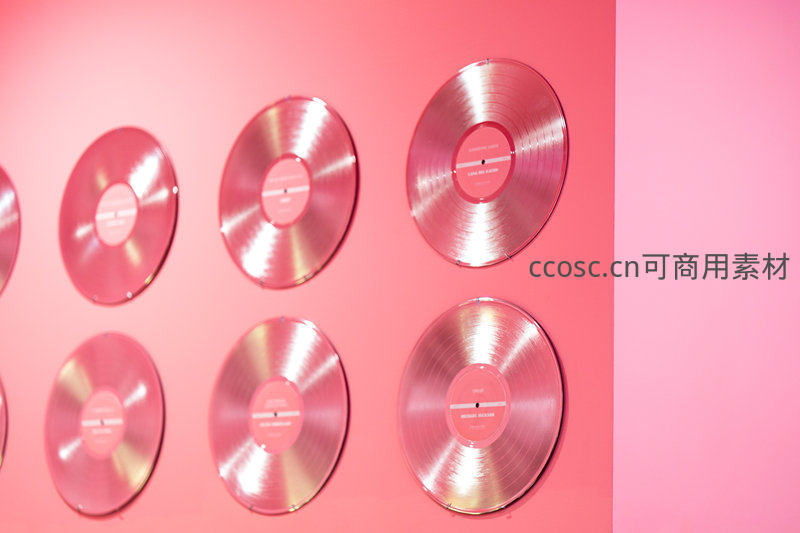 数张金属质感的银色唱片整齐悬挂在渐变粉色墙面上,反射光泽增添现代感,营造出兼具音乐氛围与视觉美感的艺术空间。