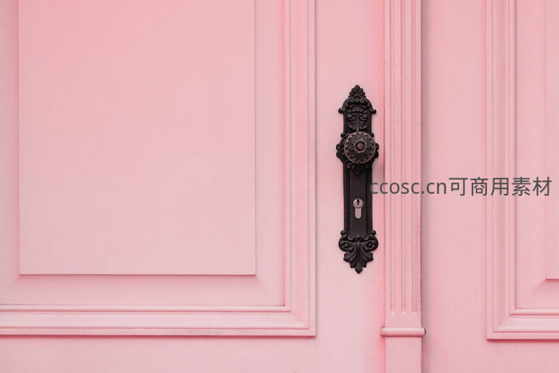 一扇柔美的粉色木门上,镶嵌着一个精致华丽的黑色复古雕花门把手,古典与现代的碰撞,展现出独特而优雅的家居装饰风格。