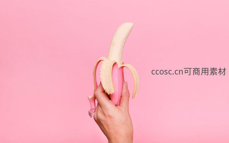 一只手握着剥开的香蕉,置于纯粉色背景前,色彩柔和,构图简洁,充满趣味与视觉冲击力。