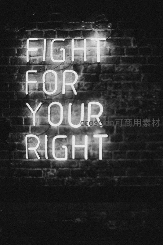 一面粗糙的砖墙上,白色的霓虹灯管拼出“FIGHT FOR YOUR RIGHT”的字样,光芒在黑暗中格外醒目,传递着力量与反抗的精神,充满街头艺术气息。