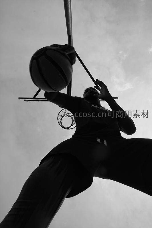 从地面仰拍运动员腾空扣篮的震撼瞬间,篮球与篮筐在灰白天空背景下构成有力剪影,展现运动的力量与美感。