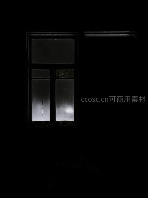 黑暗中一扇老旧窗户透出柔和白光,玻璃上的水汽与斑驳痕迹诉说着时间的故事,营造出宁静而略带忧郁的夜晚氛围。