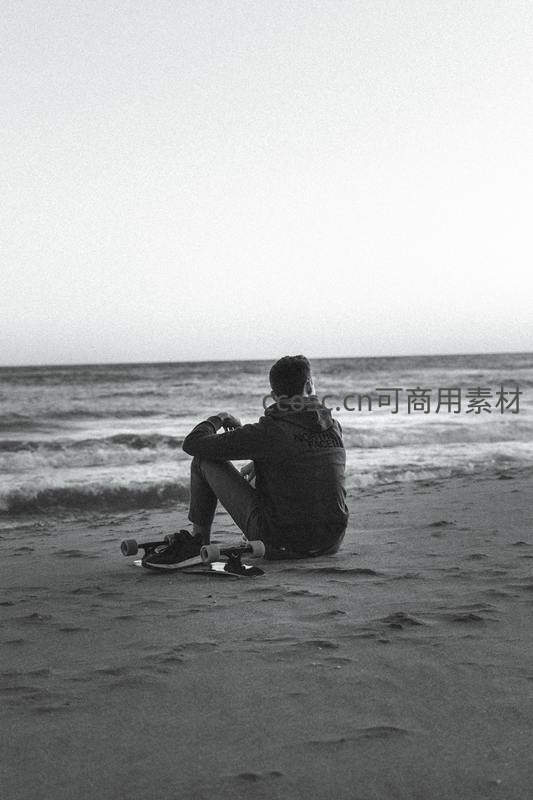 一位年轻人背对镜头坐在沙滩上,身旁放着滑板,凝望着无垠的大海。黑白影像强化了宁静与沉思的氛围,海浪轻拍岸边,仿佛时间在此刻静止。