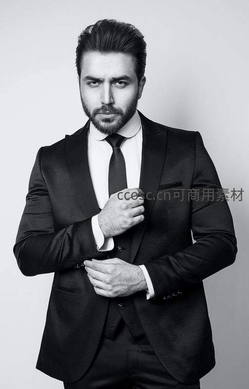 一位面容俊朗的男士身着精致西装,正专注地调整领带,黑白画面凸显其沉稳气质与专业形象,适合商务或时尚主题。
