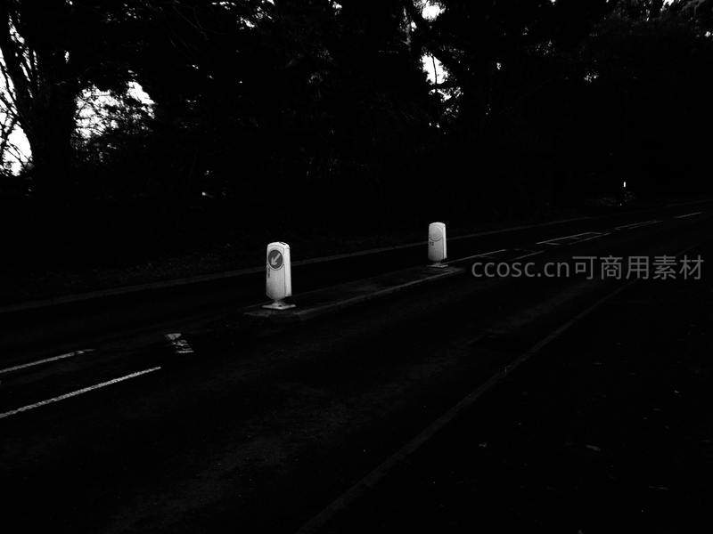 深夜的公路上,两根白色路桩在浓重阴影中矗立,周围树木漆黑一片,路面线条延伸向远方,营造出一种神秘、寂静而略带压抑的氛围。