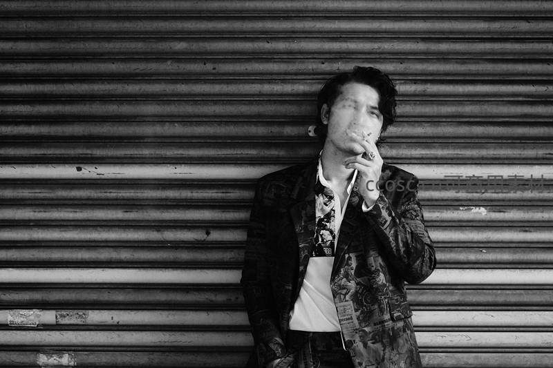 一名穿着印花夹克的男子倚靠在金属卷帘门前,手夹香烟,神情若有所思,黑白画面强化了都市街头的冷峻与孤独氛围。