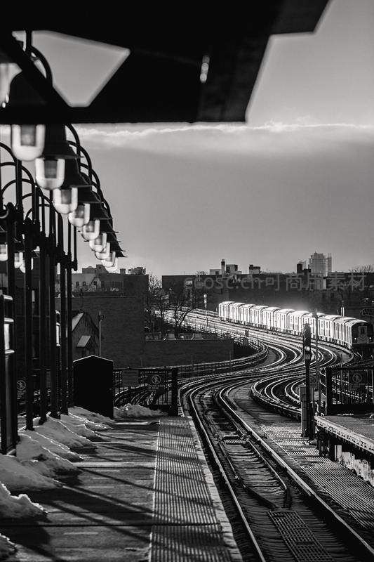 一列地铁在弯曲高架轨道上驶过,站台积雪未融,远处城市建筑林立。黑白影像赋予工业场景冷峻美感,展现都市节奏与秩序。