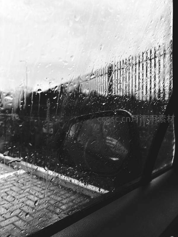从车内视角拍摄,雨滴布满玻璃,窗外的街景与后视镜在水痕中变得朦胧,营造出一种安静、孤独又充满诗意的雨日氛围。