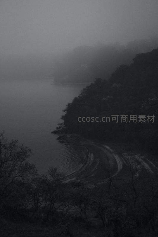浓雾弥漫于湖面与山林之间,蜿蜒的水岸线在朦胧中若隐若现,黑白影调赋予画面水墨画般的意境,传递出空灵、寂静与自然的原始之美。