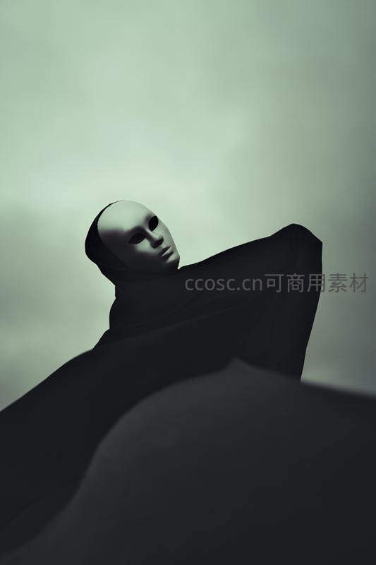 一个身披黑色斗篷、戴着苍白面具的人物,在灰绿色的天空下仰头凝视,营造出一种诡异而充满戏剧张力的神秘氛围。