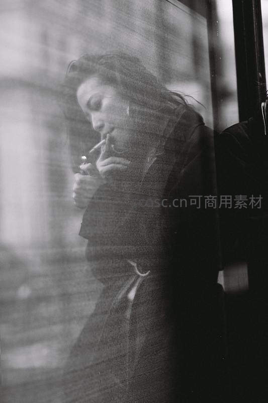 窗后朦胧女子点燃香烟