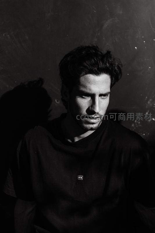 一位男士在深色背景前低首沉思,强烈的明暗对比勾勒出他坚毅的轮廓和内敛的情绪,传递出一种安静而有力的个人气质。