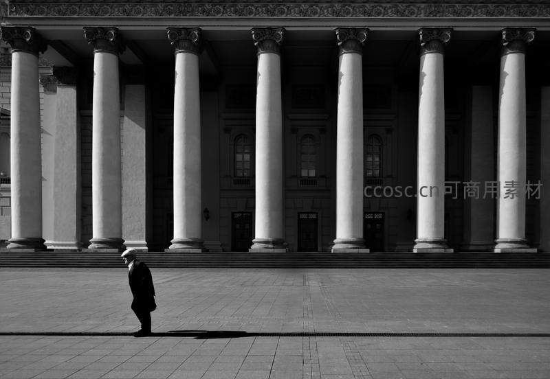 古典柱廊前孤独行人剪影