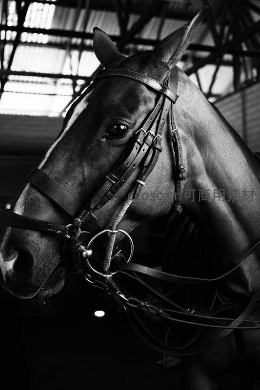 在马厩柔和的光线下,一匹马的侧脸轮廓被完美捕捉。马具的金属扣环与皮带细节清晰,展现出力量与温顺并存的特质,是一幅充满质感的动物肖像作品。