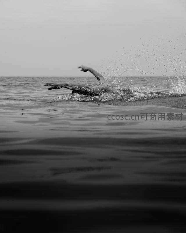 一名游泳者在广阔的海面上划水前进,手臂高高扬起,溅起的水花在空中凝固,黑白影像强化了力量感与动感,传递出挑战自我、拥抱自然的精神。