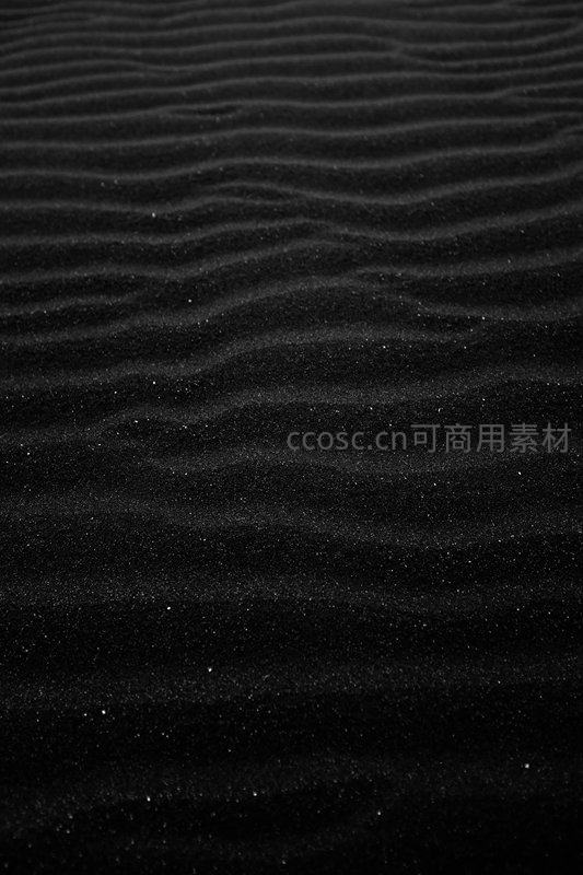 微距镜头下,黑色沙粒被风塑造成连绵起伏的波浪状纹理,细密的颗粒与柔和的曲线构成一幅充满韵律感的抽象自然画卷。