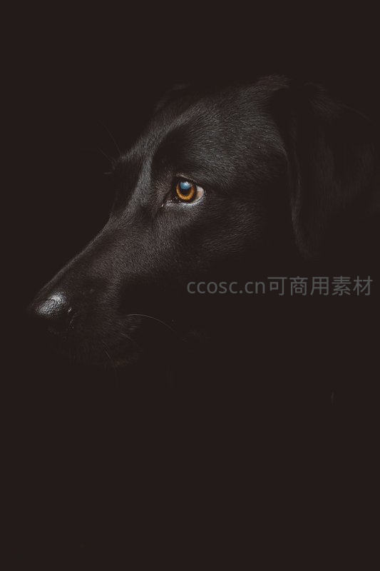 在幽暗背景中,一只黑犬的侧脸被聚光灯照亮,其琥珀色的眼睛闪烁着智慧与温柔的光芒,细腻的毛发纹理和专注神情令人动容。