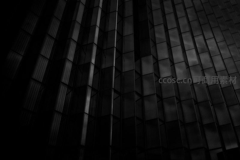 仰拍视角下,摩天大楼的玻璃幕墙反射着天空,形成富有韵律感的几何图案,展现出现代都市建筑的独特魅力与力量感。