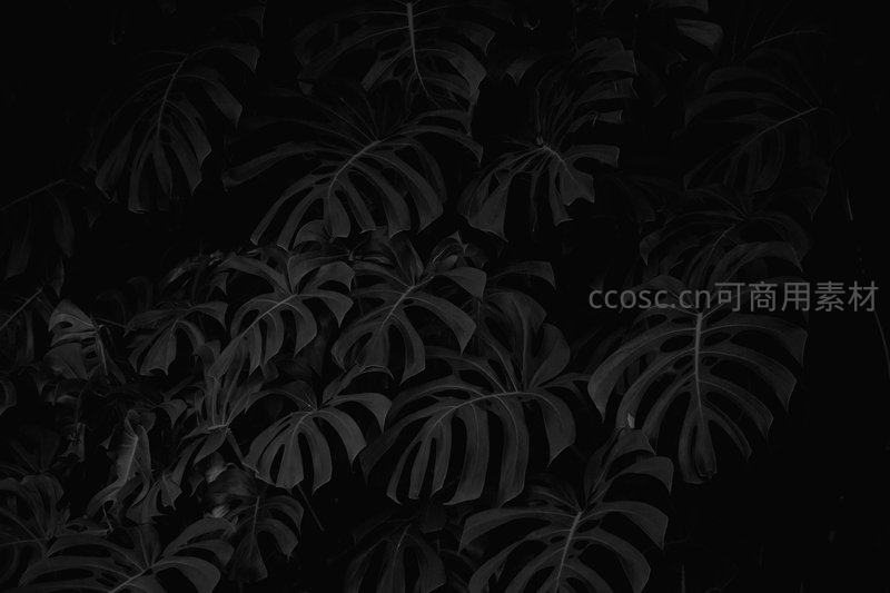 在纯黑背景下,龟背竹的叶片轮廓与复杂叶脉被精准捕捉,展现出植物在幽暗环境中的独特形态与生命力。