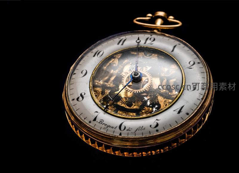 精致的复古怀表,透明表盘下可见复杂精密的齿轮结构,金色外壳在黑色背景下更显奢华,体现时间与工艺之美。