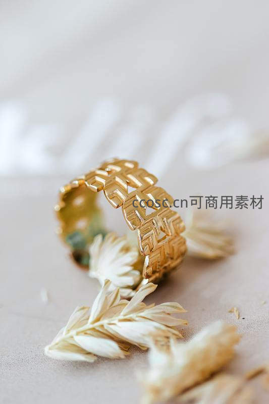 一枚具有几何镂空设计的金色戒指,与散落的白色干花共同构成雅致静物画面,柔和光线衬托出材质质感与宁静美感。