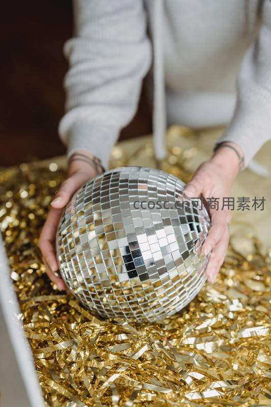 一双手温柔托起闪耀的银色迪斯科球,周围散落金色纸屑,传递出欢快节日与派对氛围,充满视觉动感与活力。