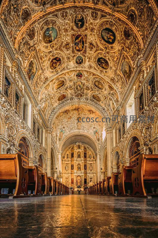 宏伟教堂内部,高耸的拱形穹顶布满繁复精致的金色浮雕与宗教壁画,阳光透过窗户洒落,照亮了庄严神圣的空间,彰显古典建筑艺术的辉煌。