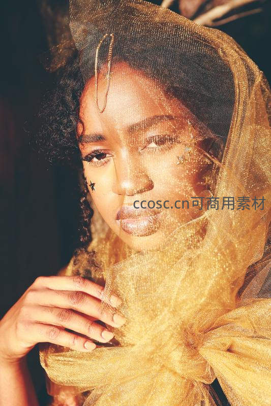 一位女性透过金色薄纱凝视镜头,面部点缀着闪亮星形贴纸,柔和光线勾勒出神秘而优雅的氛围,充满艺术感。