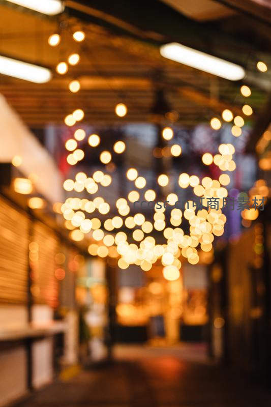 街道上悬挂的暖黄色灯串在镜头虚化下形成梦幻光斑,营造出温馨浪漫的节庆或夜市氛围,引人沉浸其中。