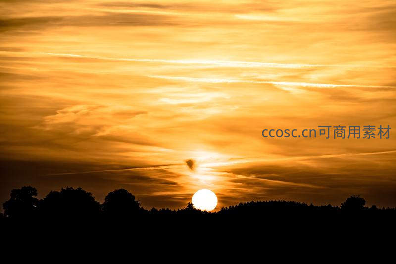一轮金红的太阳缓缓沉入黑色树影线后,天空被染成温暖的橙黄色调,层层云朵如丝绸般飘逸,营造出静谧而壮丽的黄昏景象。