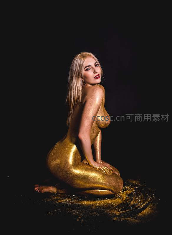 一位女性全身覆盖金色颜料,在纯黑背景下呈现优雅姿态,光影与金属质感交织,展现极致的视觉冲击力与艺术美感。