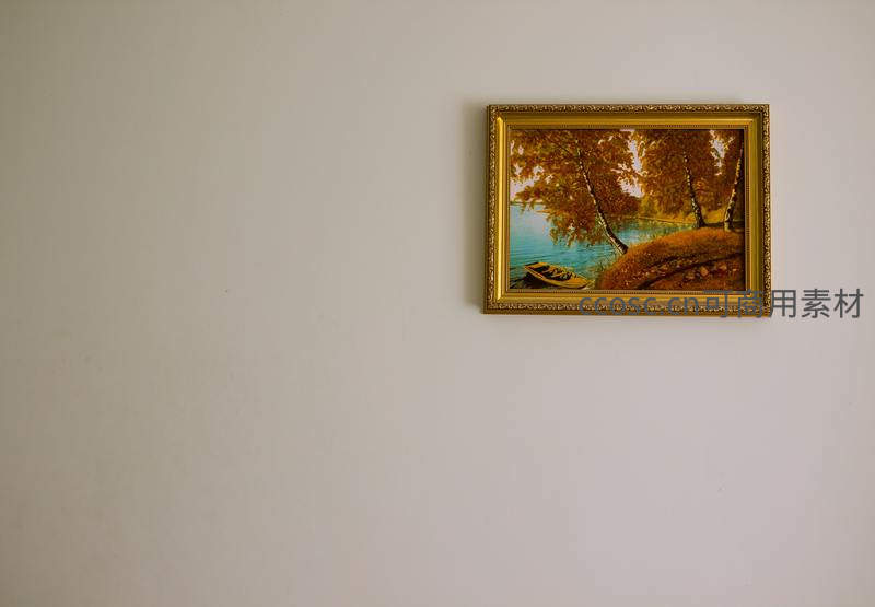 一幅装裱精美的油画悬挂在素白墙壁上,描绘了秋日湖畔金黄树林与静泊小舟,为室内空间增添自然诗意与温馨氛围。