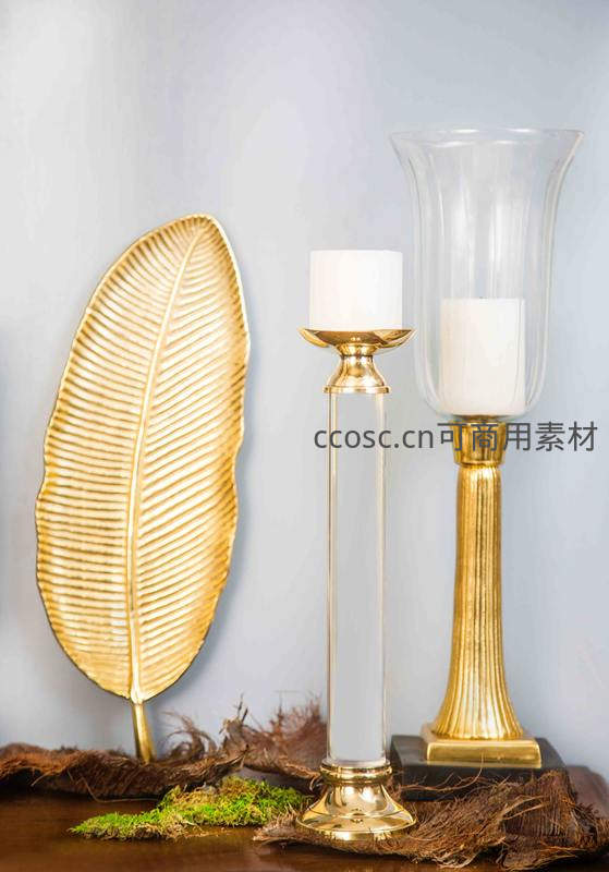 金色纹理叶片装饰与透明玻璃烛台在柔和光线下搭配,置于苔藓与干叶之上,展现精致温馨的家居美学场景。