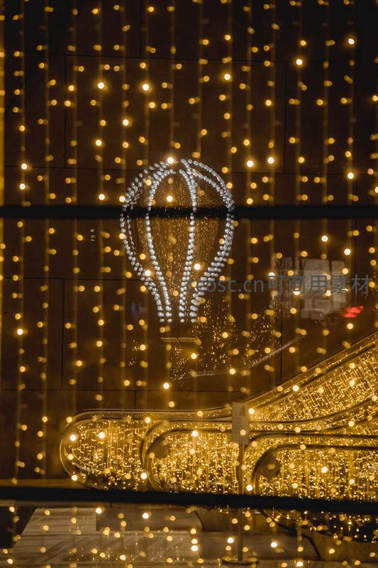 热气球灯饰下的商场自动扶梯夜景