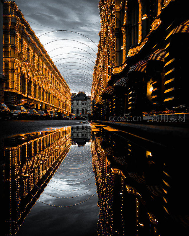 雨后街道积水如镜,映照出两侧建筑璀璨的节日灯饰与拱形光带,形成梦幻般的对称构图,营造出浪漫而静谧的城市夜晚氛围。