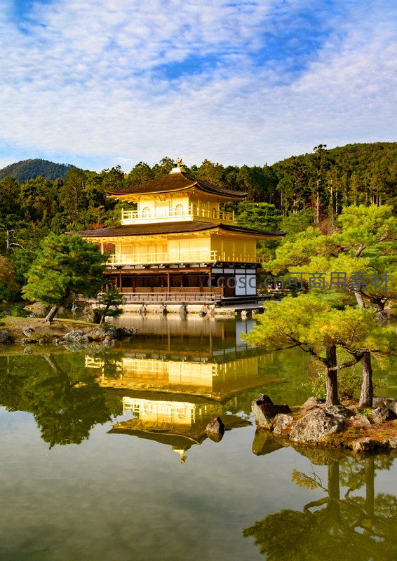 日本京都金阁寺在静谧湖水中完美倒影,金色楼阁与绿树相映成趣,展现东方古典建筑之美与自然和谐共生的意境。