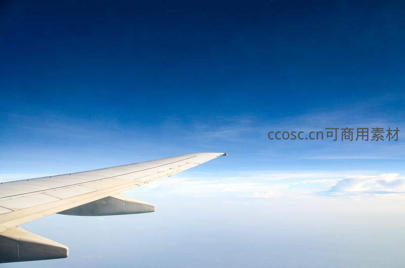 从飞机舷窗向外望去,洁白的机翼划破湛蓝长空,下方是无垠的云海,阳光洒落,展现高空飞行的壮阔与宁静。