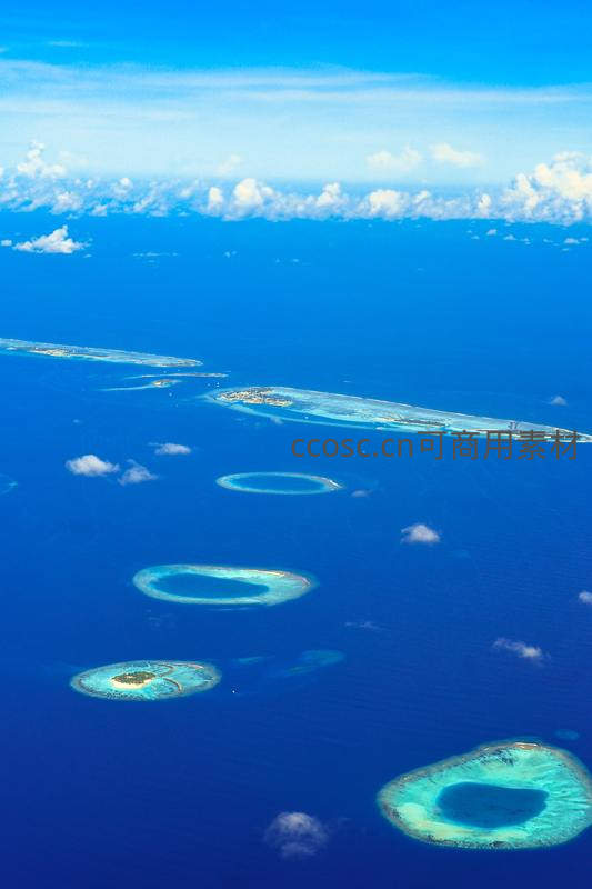 高空俯瞰视角下,深蓝色的海洋中点缀着数个翠绿的环礁岛屿,清澈的浅滩环绕,如散落人间的翡翠,美不胜收。