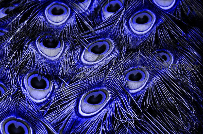 在冷色调蓝光下,孔雀尾羽的眼斑图案被放大呈现,细腻的羽丝与圆环纹路交织,展现出自然界精妙绝伦的色彩与结构之美。