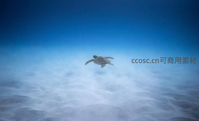 一只海龟在波光粼粼的海底缓缓游动,下方是起伏的白色沙丘,周围弥漫着朦胧的蓝色水雾,意境空灵而神秘。